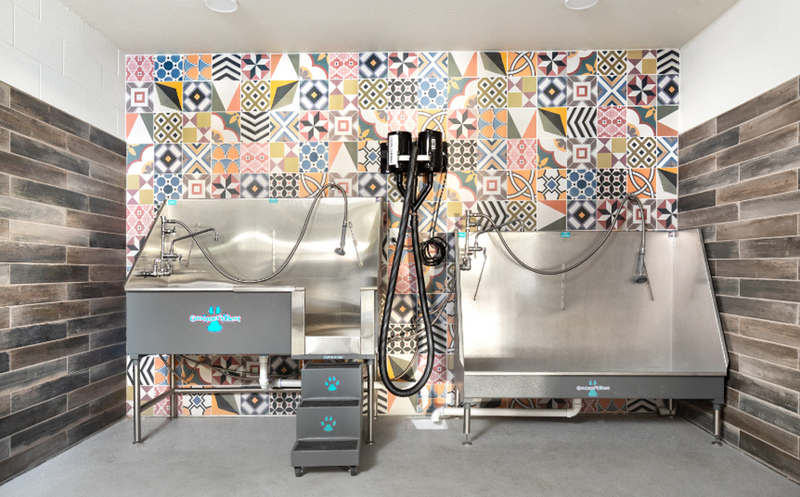 - Pet spa with stainless steel doggie tubs and blow dryers