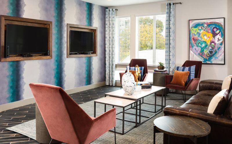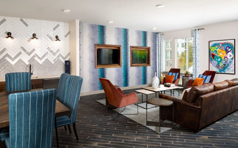 - Resident lounge featuring seating and flat screens with attached kitchen